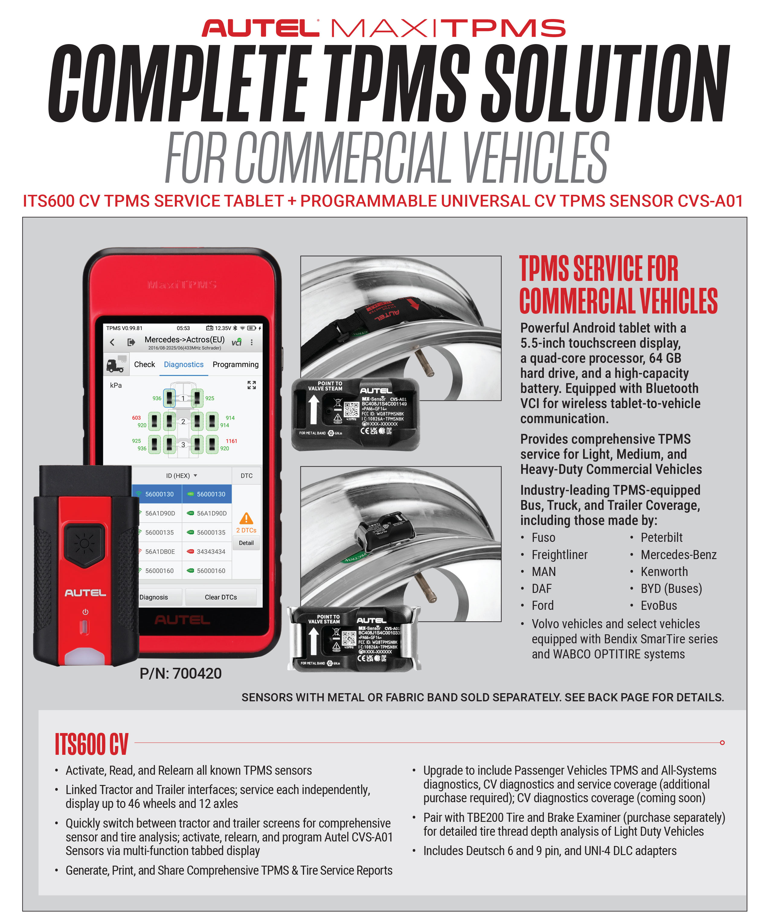 • Program the Autel CVS-A01 sensor with the Autel MaxiTPMS ITS600 CV tablet to replace TPMS sensors on light, medium and heavy-duty vehicles