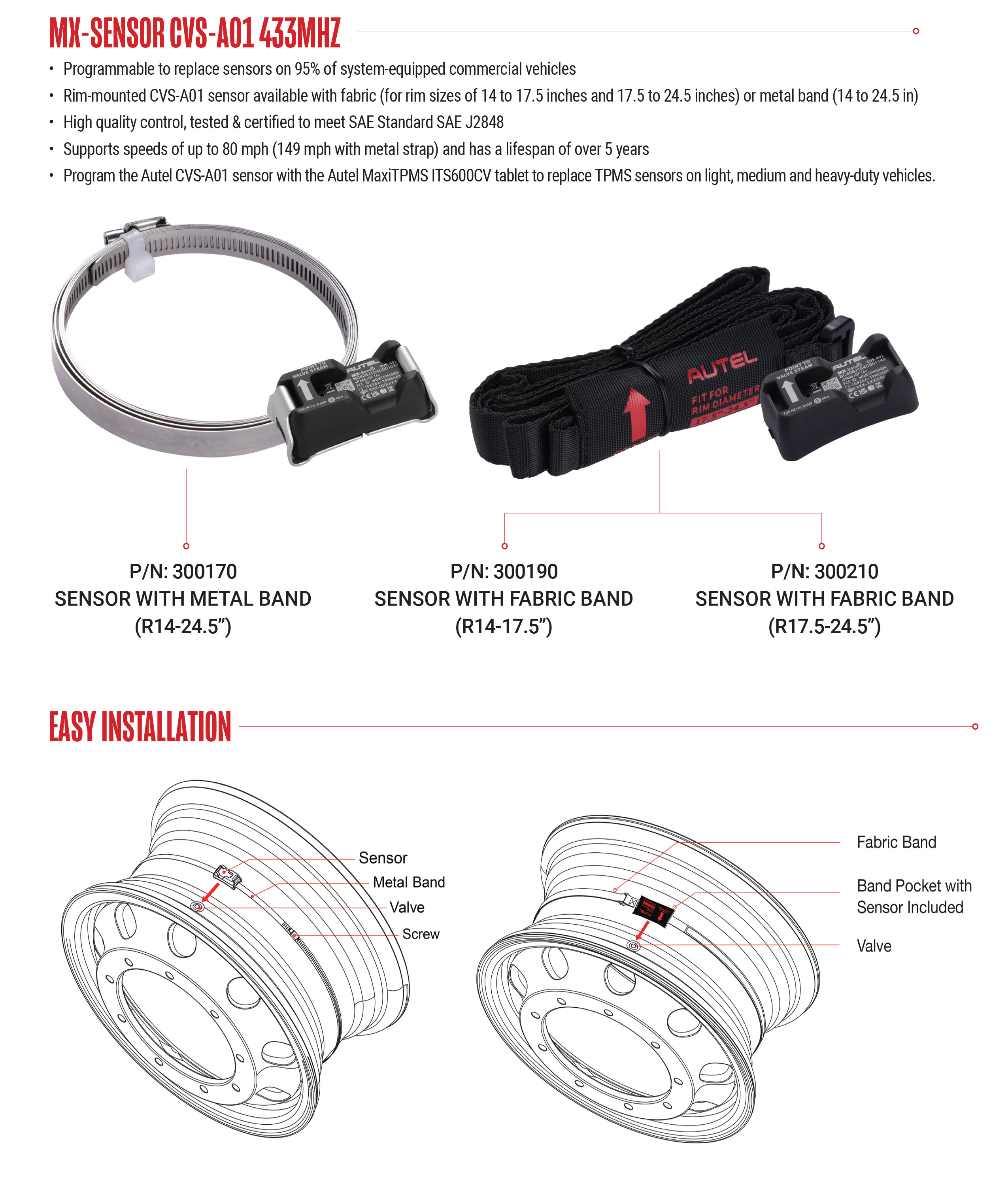 Autel MX-Sensor CVS-A01, part number 300210, is a programmable universal TPMS sensor designed for commercial vehicles with a fabric band to attach the sensor to rim that is compatible with rims sized 17.5 to 24.5-inches. Program the CVS-A01 with the Autel MaxiTPMS ITS600 CV tool to replace OE and programmed aftermarket TPMS sensors on trucks, trailers, buses all manner of direct sensor, TPMS commercial vehicles. The CVS-01 is compatible with 433MHZ frequency systems. All Autel TPMS sensors are designed to meet or exceed industry standards and offer long battery life for proven customer satisfaction