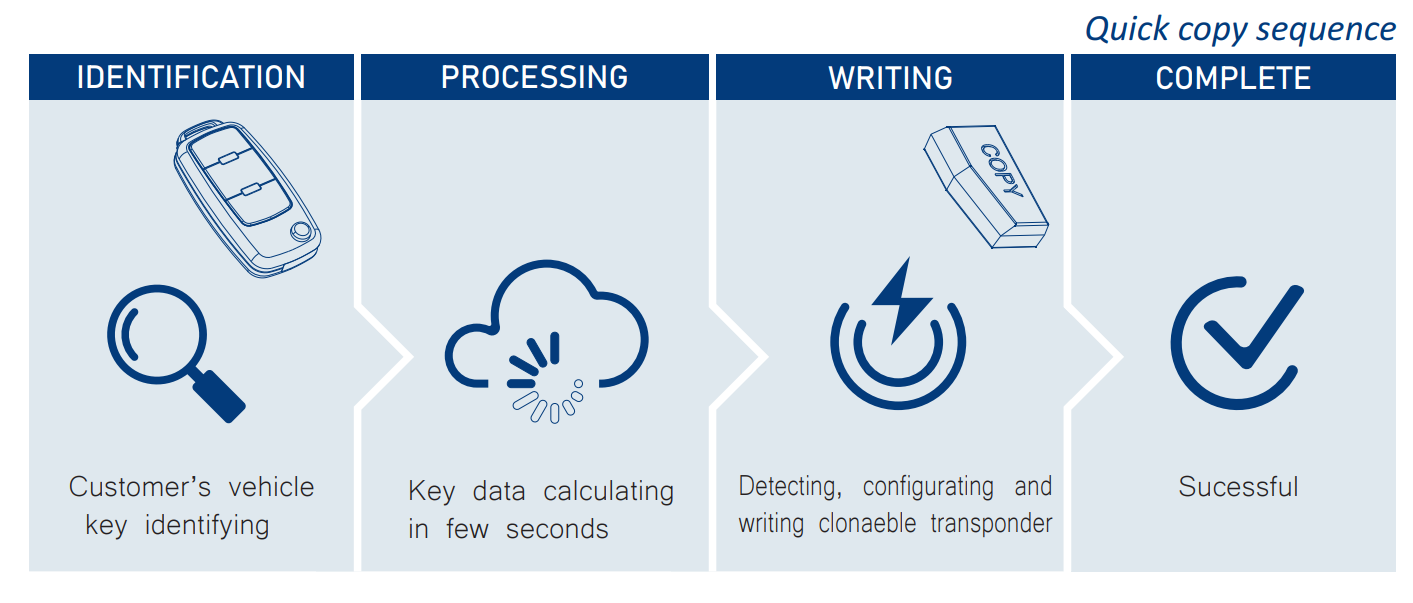 Most of vehicles transponders, including encryption transponders like Texas® Crypto-2 80 bit and Texas® Crypto-3 128 bit support quick copy which allows the user to clone keys quickly and easily. It's a simple step-by-step process that requires minimum user operations