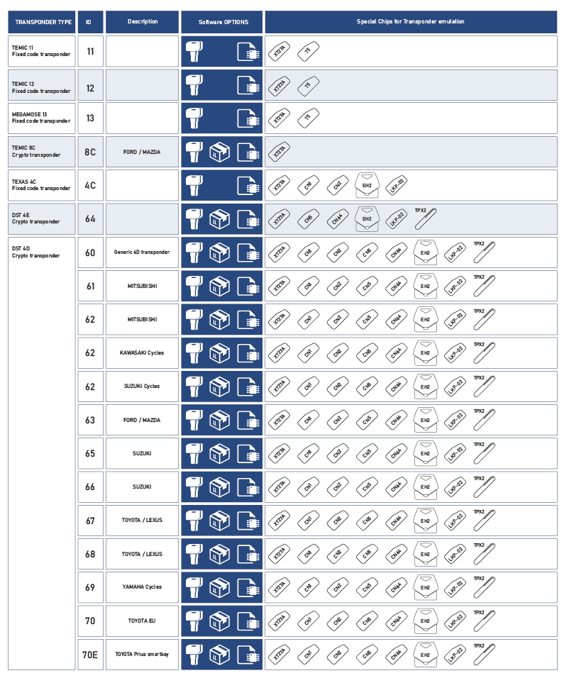 To produce a key copy, you must use special chip to emulate the immobilizer key transponder. Key Tool software support a wide range of specialized aftermarket chips (virtual transponders) that are suitable for emulating various types of car key transponders.
