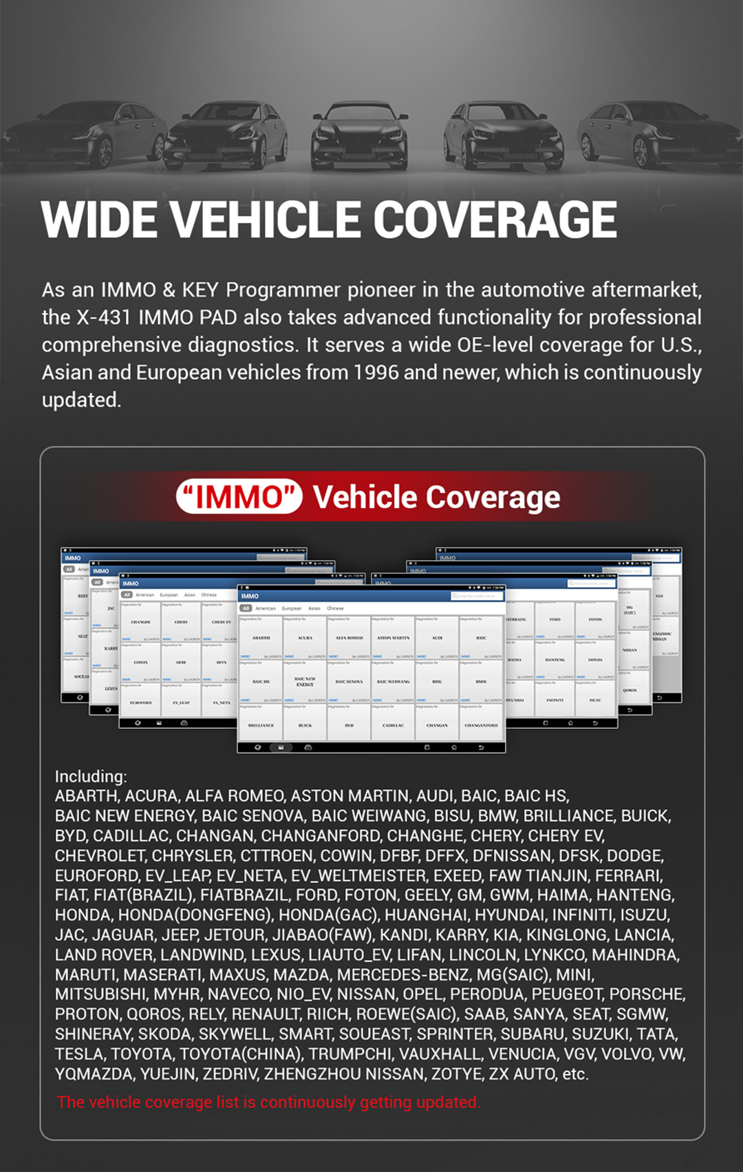 Support key matching of Ford, GM, Mercedes-Benz, BMW, VW/Audi, Porsche, Peugeot Citroen, Land Rover Jaguar, Honda, Toyota, Nissan, Hyundai, Kia, BYD, Changan Automobile, Wuling Baojun, Great Wall Motors, Chery Cars, JAC Passenger Cars, etc.