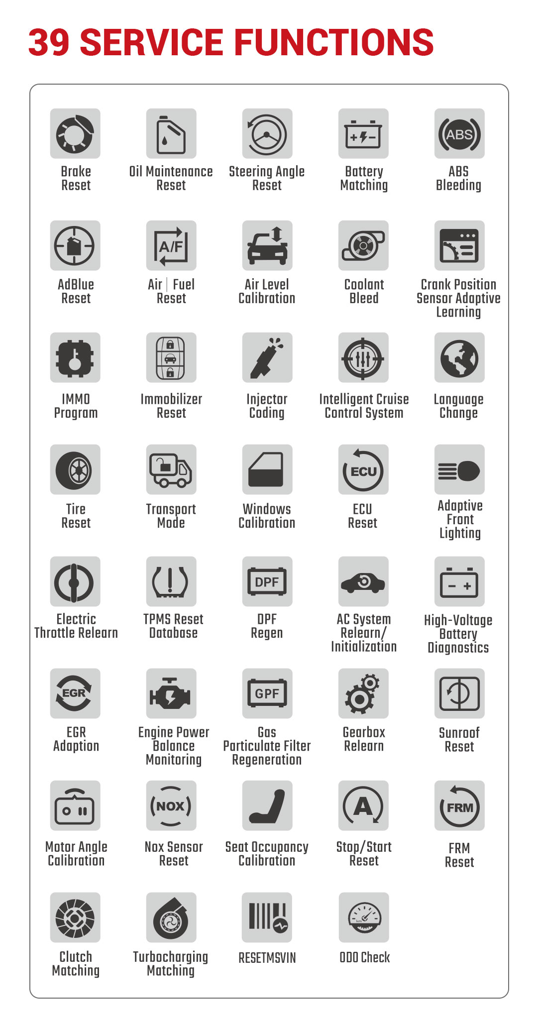 5.  Full diagnostic functionality includes comprehensive OBD II diagnostics, read/clear DTCs, bi-directional control, remote diagnosis, live data streaming, coding, etc.