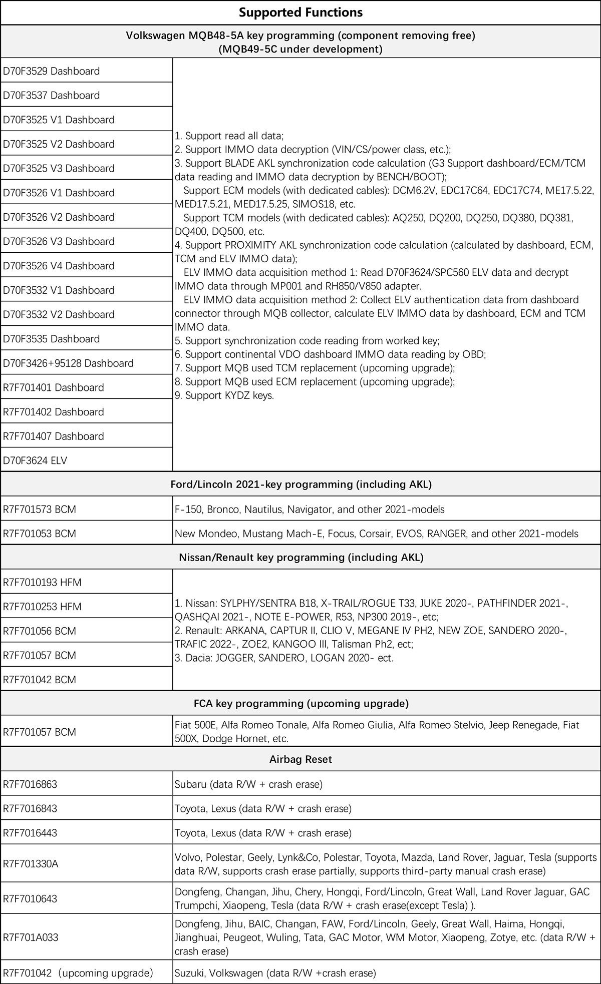 A: Because RH850/V850 adapter kit supports multiple MCU models to read/write data(with fullly coverage and good stability, so the R&D cost and BOM cost will be much higher), for example, it supports VW MQB48-5A encrypted dashboard data reading; Ford/Lincoln 2021-key programming (including all keys lost) encrypted BCM data reading; Nissan/Renault key programming (including all keys lost) encrypted HFM, BCM data reading; FCA key programming (upcoming upgrade) encrypted BCM data reading; Toyota, Subaru, domestic encrypted airbag data R/W, crash erase.