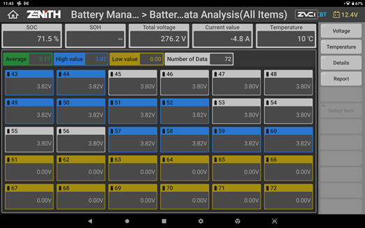 EV, HEV vehicle’s Battery information such as SOC, SOH, Voltage, Current Value, Temperature of each cell is available to check in Battery Management System of ZENITH Z7