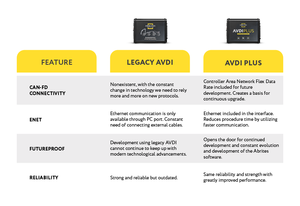 Abrites AVDI Plus is an updated hardware version of the well-known Abrites main interface for vehicle diagnostics and programming. It enables faster operation and interfaces like CAN-FD and Ethernet to keep up with changing automotive market, while keeping the legacy interfaces and supporting most of the existing Abrites hardware peripherals.