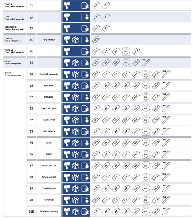 - Toyota/Lexus ID67, ID68, ID70, ID70E transponder keys.