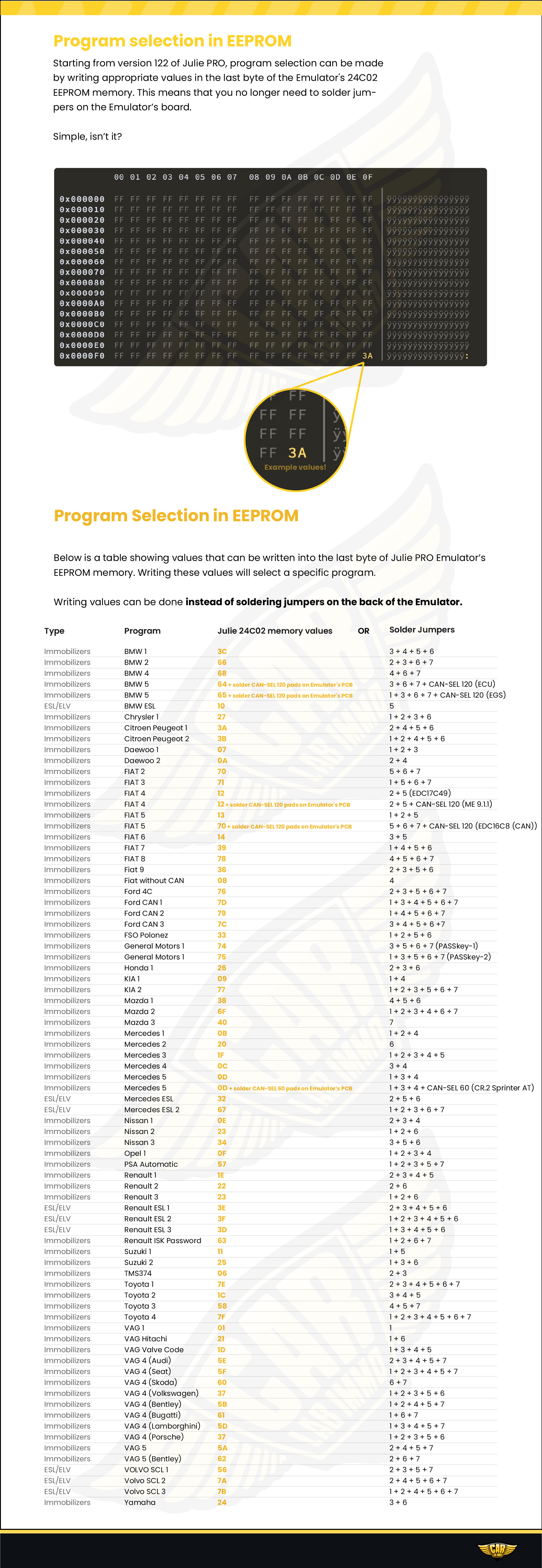 Program selection and writing values is made in Julie PRO 24C02 EEPROM. And if you use 24C02 EEPROM Memory Adapter for Julie PRO , you will no longer have to solder jumpers or unsolder Julie 24C02 EEPROM.