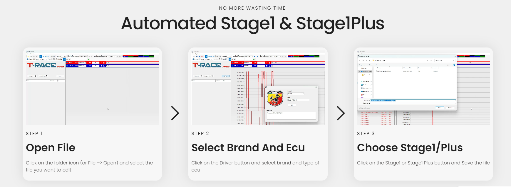 With the simplified graphics of T-Race Pro Sw, it will take you a moment to modify your vehicle. Just One click to perform a Stage1 or a Stage1 Plus
