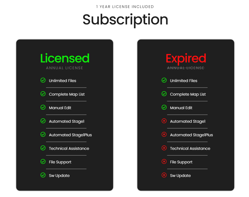 Once the license has expired, the software will continue to function but Automatic Stage1 and Stage1 Plus are deactivated. For this it will be limited compared to the version with active license