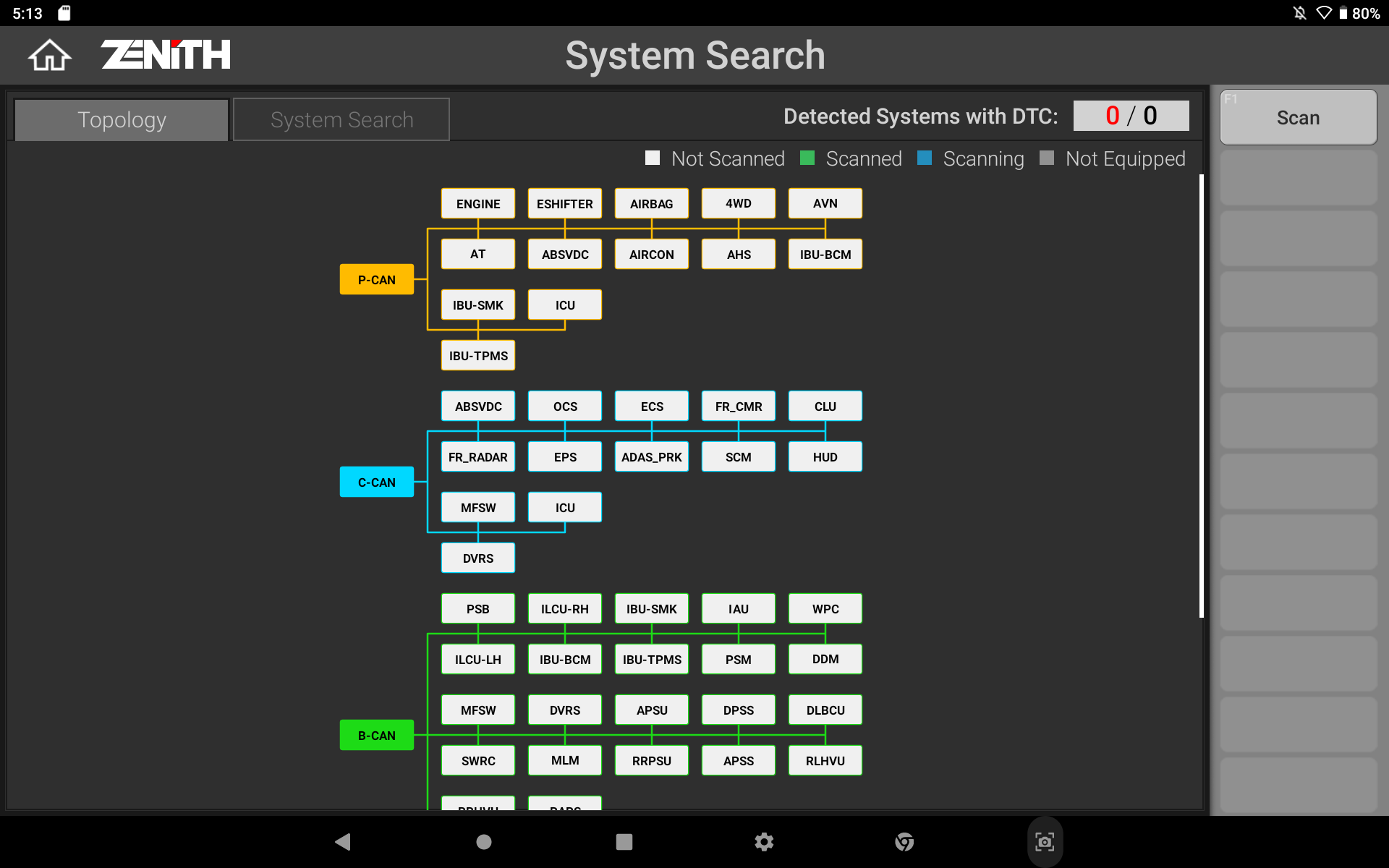 Zenith also offers ultra fast Topology scan function that scans all the vehicle systems, reports fault codes, and provides access to advanced diagnostic functions in each detected system.